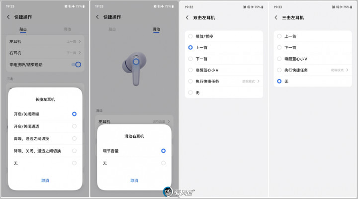 双耳都能滑动调节音量,但没提供滑动切歌等更多的选项,这个比较可惜。