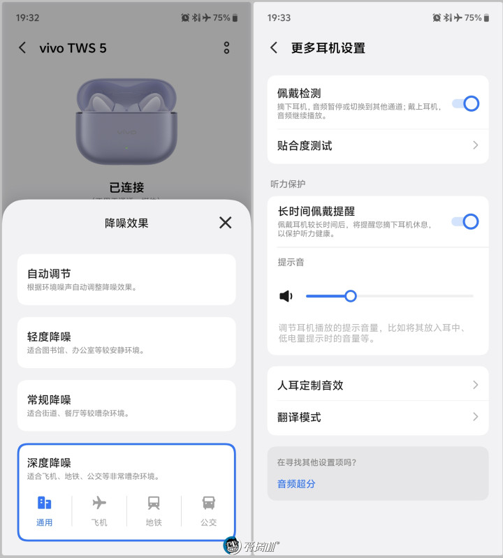 本金耳朵,平时在公交用降噪耳机,都是最低档音量听歌的,而在飞机上用第二档就够用了。以前最低档就听个响,而vivo TWS 5,甚至还能不少高频细节,Wow Awesome。